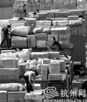 城东一批发市场门口,厢式运输车的车顶一派繁忙。换季加上双十一的重叠效应,对运输行业是个不小的考验。记者 杜国平 摄