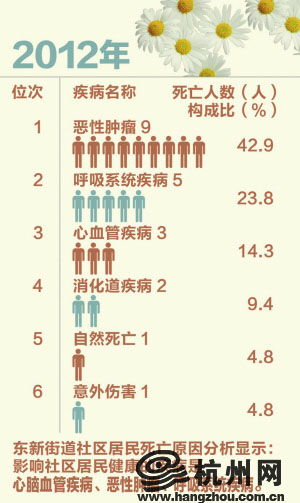 其实空气好不好,与我们的健康也息息相关。在东新园社区的这次调查中,社区统计了2011年和2012年居民死因排位表,2011年排前四位的分别是:恶性肿瘤、心血管疾病、自然死亡和意外伤害,而2012年,前一年没有出现的呼吸系统疾病,已经取代心血管疾病,成为死因第二位。