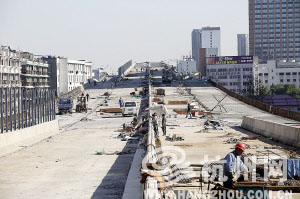 德胜快速路西延伸段在文一西路保俶路口落地,虽然高架的结构已经搭起来了,但高架桥面还是坑坑洼洼的。城基中心介绍,现在这一段有几百名工人在施工,确保年底建成通车的目标能够完成。