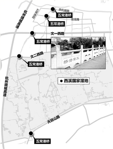 “三年前,我骑车经过天目山路五常大道口,就看到一座桥上刻着‘五常港桥’四个大字,当时印象很深刻。可去年10月份,我骑车经过西溪湿地,发现在文二西路上跨五常港的那座桥也叫这个名。”当时苏爷爷纳了闷,这桥还能搬家的呀?