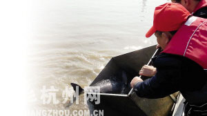 昨天中午,在微波粼粼的钱塘江江面上,杭州市渔政监督管理总站的工作人员,把一条银灰色的幼体江豚放回钱塘江,让小江豚去找江豚妈妈。