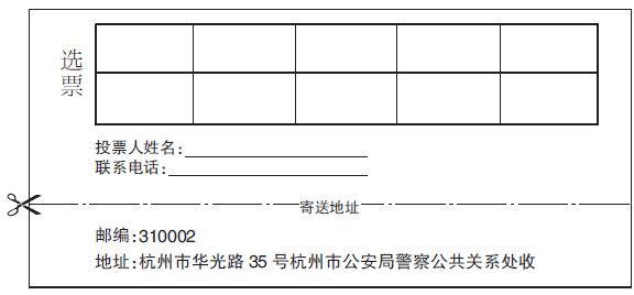 用钢笔或圆珠笔填写。将选票沿框线剪下,贴在信封背面。寄往杭州市华光路35号杭州市公安局警察公共关系处收(可将选票最下栏的寄送地址剪下直接贴在信封上)。邮编310002。选票截止时间2013年12月30日晚上9时,以邮戳日期为准。