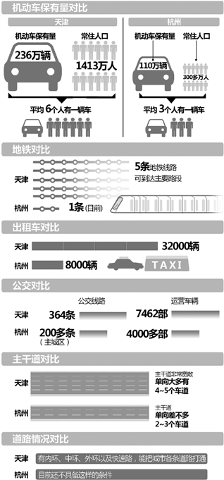 在这里我们试图用一组最直观的数据对比(见图)和一组来自相关职能部门的声音,来探讨天津限牌带给杭州的启示。