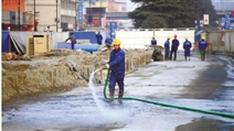 ③车刚驶过工地,工人们就拿出了水管,开始朝地面洒水。 连国庆 吴崇远 陈锴凯/摄