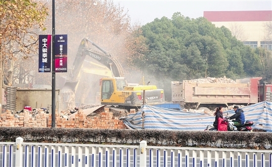 ①昨日下午1点多,在杭州东新路上的一处拆房工地上铲车正在铲运废砖块,马路一边尘土飞扬。
