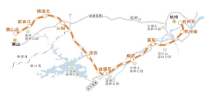 杭黄铁路总长287.3公里,从杭州东站出发,沿途设10个站点,分别是杭州东、杭州南、富阳、桐庐、建德东、淳安、三阳、绩溪北、歙县北、黄山北。终点站黄山北站,距黄山风景区约50公里,坐汽车半个小时就能到。