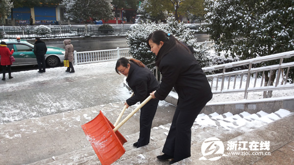 杭州汽车西站职工在车站门口除雪