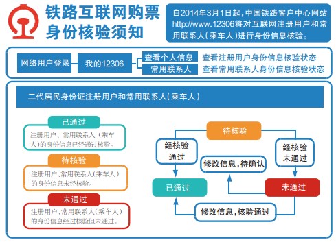 “未通过”:指注册用户、常用联系人(乘车人)的身份信息经过核验但未通过,需修改本网站所填写的身份信息内容与二代居民身份证原件完全一致,保存后状态显示“待核验”时,需持二代居民身份证原件到车站售票窗口或铁路客票代售点办理核验。