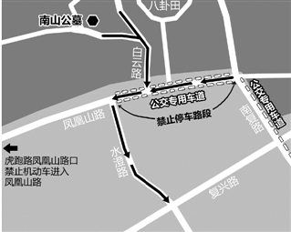 ●白云路的南山公墓大门至凤凰山路段,机动车由北向南单行;
