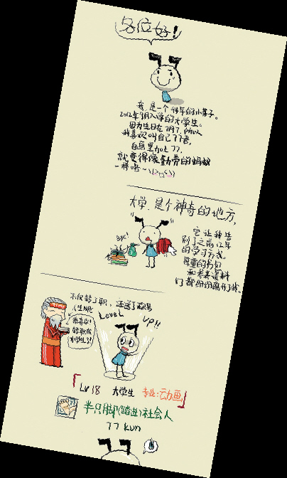 浙江工业大学之江学院王微巧才读大学二年级,她因为生日在7月7日,所以取名叫77君,“在自画像里加上77,就会变得像勤劳的蚂蚁一样咯!”她的简历写得很认真、很用心、很有礼貌,她的手绘插画风的简历博得同事们一致赞扬:“太可爱了!”“太喜欢了!”“这是天赋呀!”