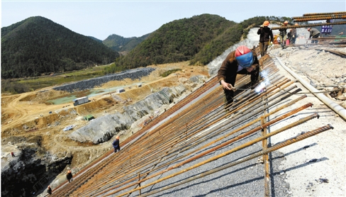 工人正在闲林水库大坝加紧施工,该坝6月中旬蓄水,将在主汛期发挥重要拦洪作用。