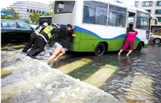2013年10月8日,人们在环城西路积水中推行抛锚公交车。