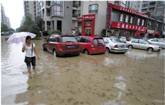 2013年10月8日,西溪路水淹成河,市民只能趟水过街。