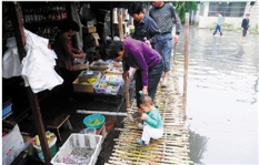 2013年10月9日,身处积水的华丰社区居民靠搭竹排进出。