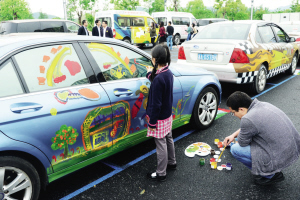 活动一开始,广场上就是一幅欢天喜地的大场面——在家长的带领下,小朋友玩开了,颜料、调色盘、画笔满场飞……6岁的小朋友悦悦拿着沾满颜料的笔,一笔一画地在爸爸的车上画各种形态的“愤怒的小鸟”,而且一画就是3个小时!一时间,愤怒的小鸟、葫芦娃、熊出没、大力水手、小黄人等经典动漫形象栩栩如生地爬满了各种“车身”,等待专家组来“评阅”。