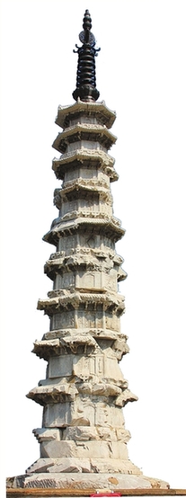 白塔共九层,高约15米,平面八边形的楼阁式塔建筑,逐层划分,比例适度,出檐深远,起翘舒缓,轮廊秀丽挺拔。塔基雕刻有山峰、海浪等纹饰,象征着“九山八海”,其上有须弥座。须弥座束腰上刻有佛经,再上分为九层,每层由塔身、塔檐和平座三部分组成,塔身上浮雕有佛、菩萨和经变故事,人物形象惟妙惟肖,刻画生动。