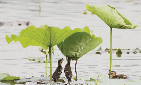 孤山这里的西湖,荷叶已经长出来了,鸳鸯宝宝在荷叶下玩耍。 快拍小友 古色月影 摄 (第五届西湖荷赛正在征稿,照片请上传快拍快拍网·西湖荷赛频道)