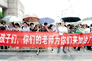 大一学生来到考点门口为考生们加油。记者 李忠 摄
