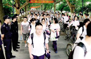 早上8:20,小徐在杭高门口四处张望,心里在盘算着:该来的都见到了,没人落下。小徐是杭高的高二学生,昨天早上7:40就赶到了杭高的门口,为各位学姐学长们加油鼓劲,同时也可以提前感受一下高考的气氛。没想到,在高考现场还遇上了自己的同班同学,另外两名高二的女生也抱着“看一看”的心态来围观,“我怕明年自己会紧张,所以今天先来适应一下。”其中一名女生说,看到现场这阵势,感觉就像自己来高考一样,心跳一下子加快了。