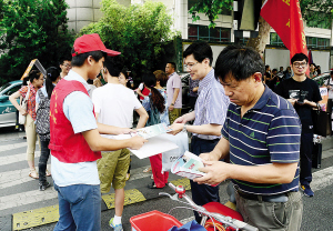 昨天上午,中国计量学院10名志愿者分别来到杭高、杭四中等10个考点,发放杭州日报精心制作的《2014高考志愿填报指南》。若现场未领到,家长可以前往报社(杭州市体育场路218号杭州日报新闻大厦一楼杭报广告部)领取。记者 郑承锋 摄