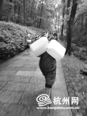 昨天下午4点多,一位60多岁的大伯肩扛两只大桶去虎跑取水 记者 董吕平 摄