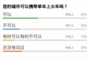 中国骑友网昨天在微信上发起了一个投票,“您的城市可以携带单车上火车吗?”截至昨晚9点多,有856人投了“可以”,占42%;407人投了“不可以”,占20%;有269人投了“有时可以有时不可以”,占13%;还有466人投了“还没有试过”,占23%。