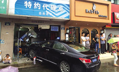 手机店老板说,车子撞进店里后,女司机从车上下来边哭边说,“我把油门当刹车了”。