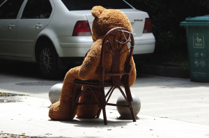 终于放晴了,邻居家把大玩偶拿出来晒,坐在椅子上,憨态可掬。 快拍小友 ftt 摄