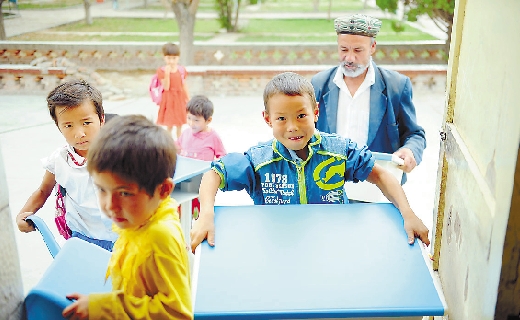 热依来提穿上只有过节才会穿的漂亮衣服,还给两根小辫子扎上了彩色的球球。尽管个头小,但她还是坚持自己把新的课桌椅搬进了教室。
