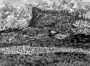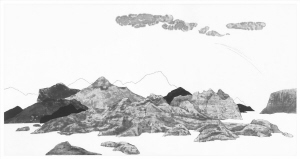 张晓锋《山水清音》木版水印98×188cm,2013年:作为中国当代青年版画家,张晓峰的这幅《山水清音》曾经获得第二十届全国版画展优秀奖。山水是他向来喜欢涉猎的主题,这幅作品,在传统木版水印的基础上,融入了艺术家自己的创新,比如在表现山川的体积、厚度时所运用的浓淡、层次处理方法。