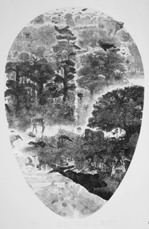 小林敬生《日复升——绿色星球》100.5×66.5cm 木口木刻:“我专心雕刻木板,就如同耕作土地一般,”小林敬生这样说道。这幅《日复升——绿色星球》,是现场最吸引人驻足的作品之一。不光是画中各种各样的动植物,更因为艺术家在画中传递出来的地球、自然和生命主题。