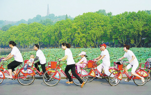公共自行车已成为杭州市民和中外游客不可或缺的交通工具。