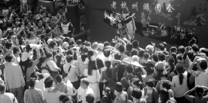 昨天大兜路上的老杭州游园会也人头攒动。经快报征集并筛选出的8位民间艺人就在这里设摊表演。