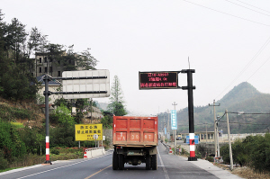 记者跟随王旭军来到千秋关检测现场,当一辆6轴货车经过千秋关路段时,司机会看到前方有块大型LED屏,显示出车牌、轴数、超载数量等信息,并提醒司机,到前方驳运站卸载。