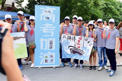 十几位杭电学生穿着亮眼的海魂衫,拉起加油海报,一起喊着:“大学那么美,我想去看看!”一时吸引了很多家长注意,围上来询问这所大学的情况,杭电学生热心解答。