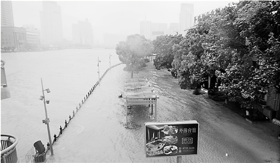 昨天,宁波迎来强降水,由于恰逢高潮位,宁波地标建筑江北老外滩积水严重。 龚国荣 摄