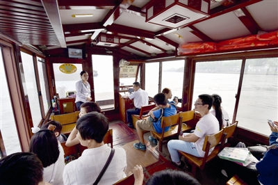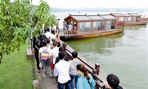 白堤上的游客正在排队搭乘免费渡船绕行断桥。