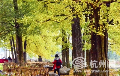 杨家村口的古银杏主题公园,是每年举办“银杏之秋”节开游式的地方,银杏树最为密集,熟知度也最高。徜徉在公园里,抬头望去满树的金黄。微风吹过,一片片扇形叶子便翩然而下,轻轻地落在你的肩、你的发丝,好似久别重逢的朋友,几分感动萦绕心头。满地的落叶,玉骨冰肌未肯枯,柔美得让你不忍心踩踏挪步。