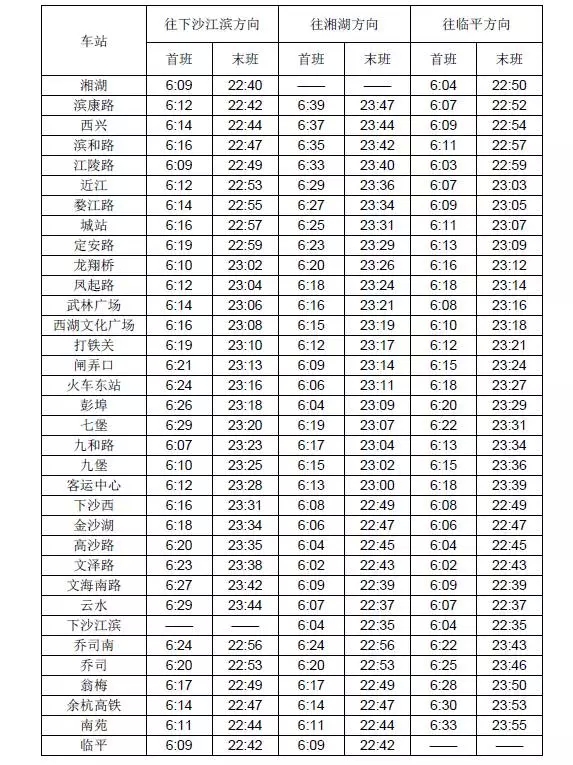 首末班时间微调,以湘湖站为例,开往下沙江滨方向,首班时间从6:10调整为6:09;末班时间从22:32分调整为22:40;往临平方向,首班时间从6:05调整为6:04,末班时间从22:40调整为22:50。