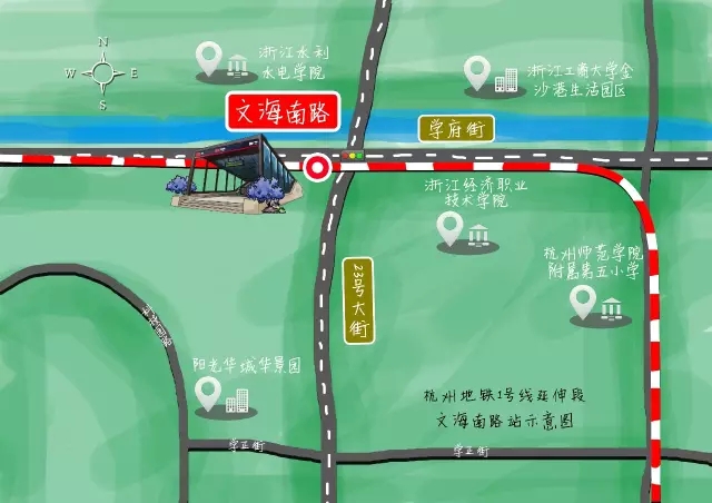 文海南站位于下沙2号大街与23号大街交叉口,往北与浙江水利水电学院、浙江工商大学金沙港生活园区隔河相望,往东与浙江经济职业技术学院、浙江工商大学下沙校区遥遥相对。