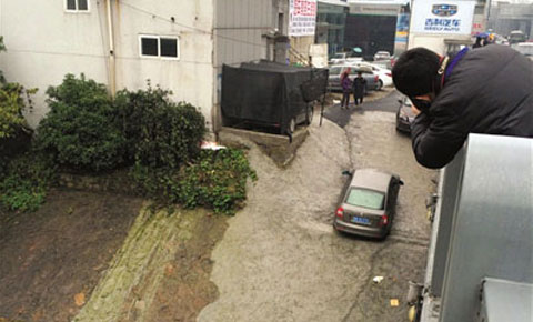 没过一会,从桥附近的4S店里走出来几个男子——他们都是小伙子的同事。其中一个钻进斜坡靠上面的吉利轿车,打开车前大灯,发动车子,挂倒挡、松手刹、踩油门,动作非常娴熟,紧接着听到“轰”一声,车屁股后面冒出一股热气,车子往后顿了一下,开始倒车。