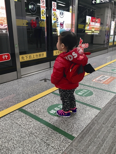 网友“王珂”发来一张图,充满了萌意,图中一个3岁左右的小女孩,扎着两个小辫子,背着一个红色的小书包,乖巧地站在绿色的候车区内,安静地注视着屏蔽门。