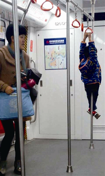 网友胡先生发来一张图,引起不少人关注。图中一个5岁左右的小男孩,两只手拉住拉手,双脚盘在拉杆上,整个人挂了起来,似乎在完成一组高难度的吊环比赛。这样的动作既危险又不雅观,胡先生希望通过曝光这样的行为,给大家提个醒,“毕竟地铁车厢里的文明关系着乘车的每一个人”。希望带孩子的家长尤其引起重视。