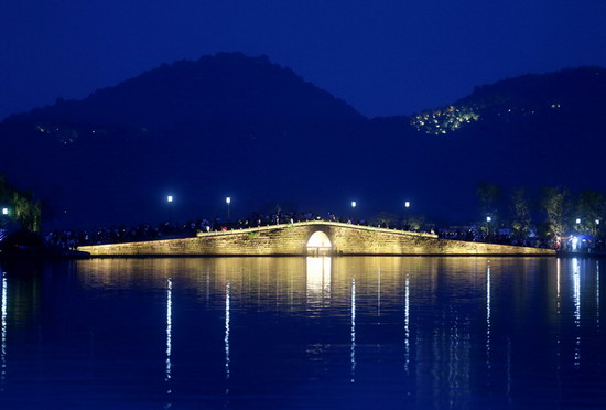 灯光勾勒出锦带桥的桥身轮廓,和西湖群山的夜景遥相呼应,就像一幅水墨画卷。林云龙 摄
