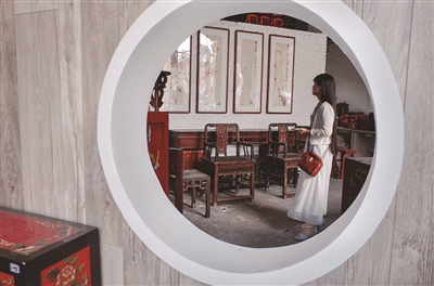 展示厅里堆放着不少尚未安置到位的老式雕花彩绘家具和字画,正中央,端端正正摆了一张装裱完好的字,是徐志摩《恋爱到底是怎么一回事》里的话:“我再不想成仙,蓬莱不是我的分;我只要这地面,情愿安分的做人。”