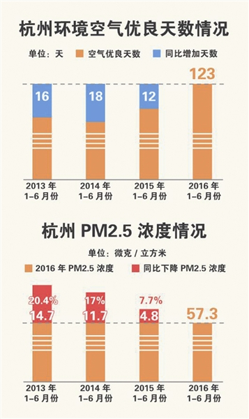 今年1至6月份,杭州市环境空气优良天数累计123天,与2015年同比增加12天,与2014年同比增加18天,与2013年同比增加16天。