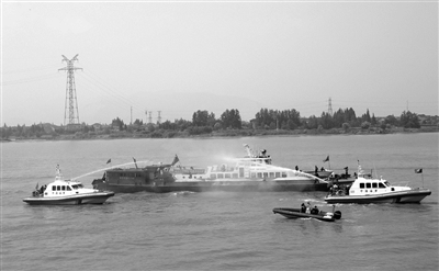 为确保桥梁安全,海事、公安部门出动14艘巡逻艇、4艘公安艇拦截可疑船舶。见情况不妙,货船上蹿出两个人,将燃油倒在船上并点燃,船舶火势迅速扩大。