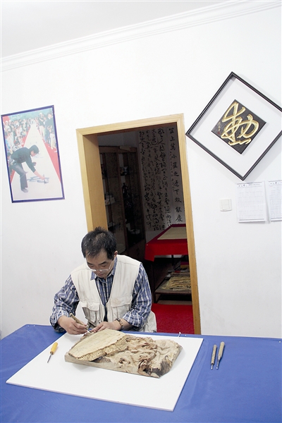这名书刻艺术家名叫许乐平,在他的“铁笔”之下所创造的名人肖像,立意巧妙,线条流畅,刚毅中还透着铜雕的质感。