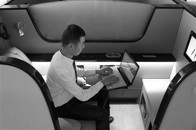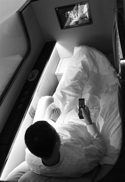 还有一种是“商务舱”,长2米、宽1.05米,类似火车软卧区,半封闭包围。它的设计灵感来自飞机头等舱,但功能要多很多:商务舱座椅,非常软和,可调节至平躺;侧面配备隐藏式小桌板、多个插座、杯槽、手机槽。对面是壁挂电视,电视下方有个小柜子,掀开来,是两个手提物品舱,再下面是一个电子密码保险箱和一个鞋格。商务舱的灯光可自控,配有一个万向看书灯、景观灯、头戴式耳机,可看书、看电视或听音乐。此外还有呼唤铃和布帘,安全性和私密性都非常好。