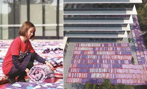 晒被子的地方,就在园区的大空地上。为了提高空间利用率,地面铺好地毯之后,小瑜她们四个姑娘将被子叠成长方形,并按不同的花色整整齐齐铺好。除了地面,绿化带的栏杆也没放过,全部挂满五颜六色的被子。